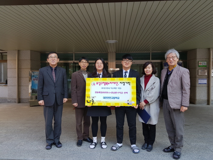 대전전민고(교장 김현태)는 4일 학교 축제기간 중 동아리 부스 운영 수익금, 스포츠클럽 ‘기부천사 런닝맨’ 후원금, 자율동아리 ‘소나기’ 김장 나눔 수익금 등 총1,684,520원을 모아 유성구 행복누리재단에 기탁했다