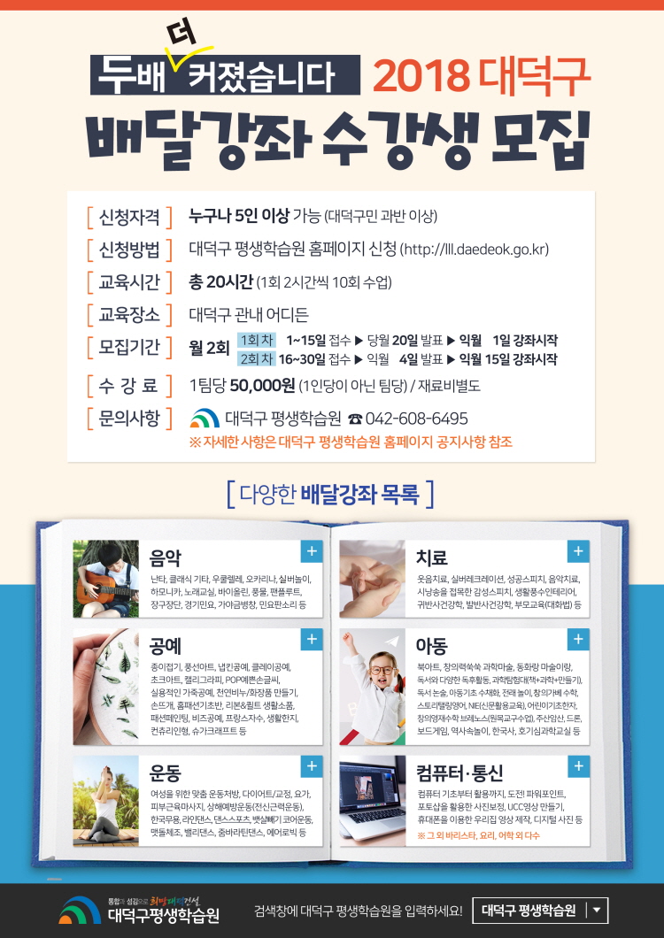 강좌 신청은 대덕구 평생학습원 홈페이지(http://lll.daedeok.go.kr) 회원가입 후 가능하며 문화예술, 학력보완, 인문교양 분야의