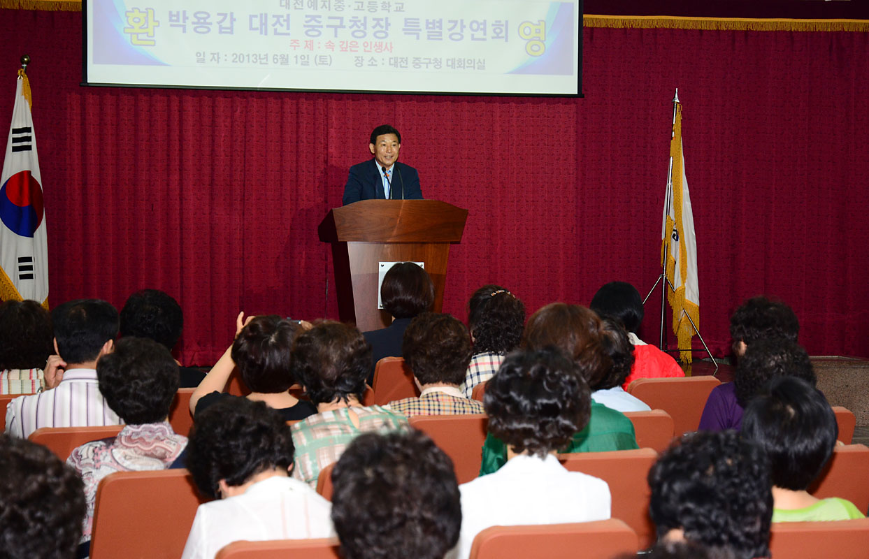 박용갑 중구청장은 1일 중구청 대회의실에서 정규학업의 기회를 받지 못했지만 성년이 되어 배움의 갈망이 넘치고 있는 대전 예지중.고등학교 학생 150명을 대상으로 『속 깊은 인생사』라는 주제로 60분간 특별강연을 펼쳤다.