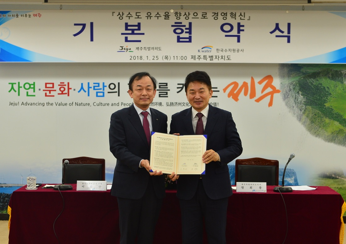 K-water (사장 이학수) 와 제주특별자치도 (도지사 원희룡) 는 25일 , 제주특별자치도청 에서 ‘상수도 유수율 제고를 위한 기본협약’을 체결했다.