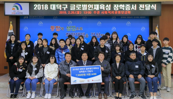 박수범 대덕구청장은 “글로벌인재육성 장학금을 통해 학생들이 꿈과 희망을 키워나갈 수 있었으면 좋겠다”며 “ 인재육성을 위해 보다 많은 기업과 구민이 함께 해주길 바란다”고 말했다.