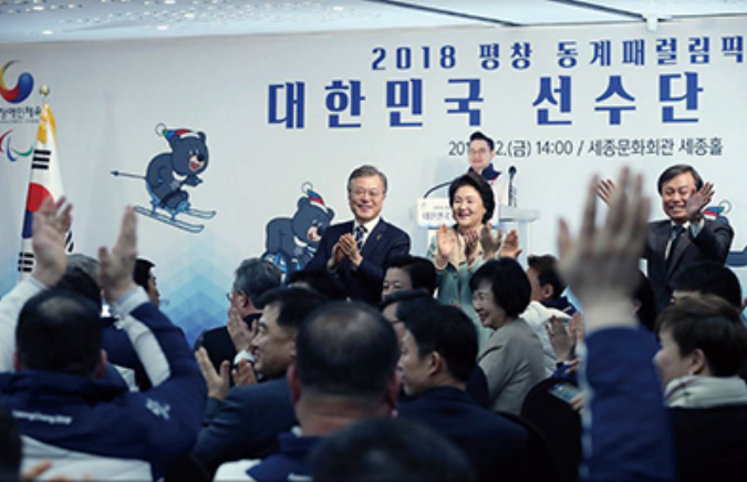 문재인 대통령은 현직 대통령 최초로 2018 평창패럴림픽대회 선수단 출정식에 참석했다.