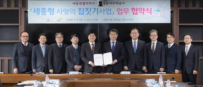 세종시와 한국토지주택공사(LH)가 9일 노인·장애인 등의 주거생활 안정을 위하여 맞춤형 단독공공 임대주택 건립 ‘세종형 사랑의 집짓기사업’ 추진을 위한 업무협약을 체결했다.