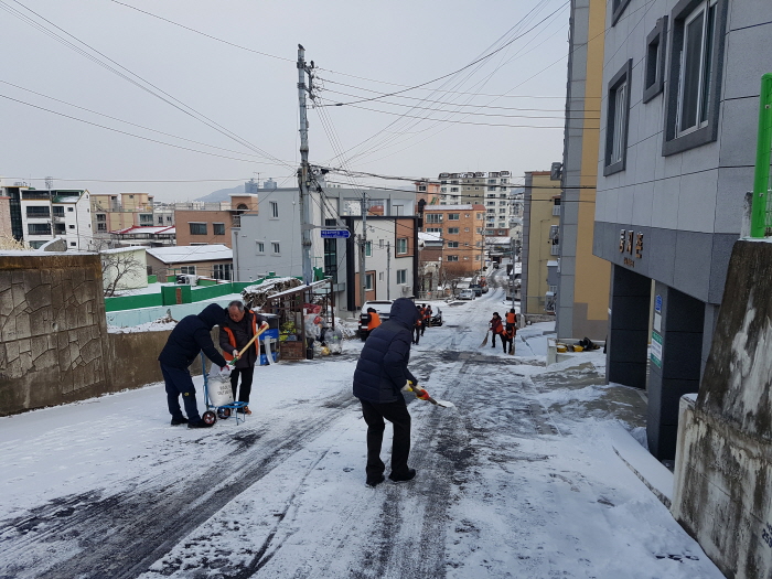 제설작업은 부사동 통장협의회, 자원봉사협의회 등 3개 동 자생단체 회원과 주민센터 직원 등 50여명이 참여해 골목길 눈을 쓸고 눈이 얼지 않도록 염화칼슘을 뿌렸다.