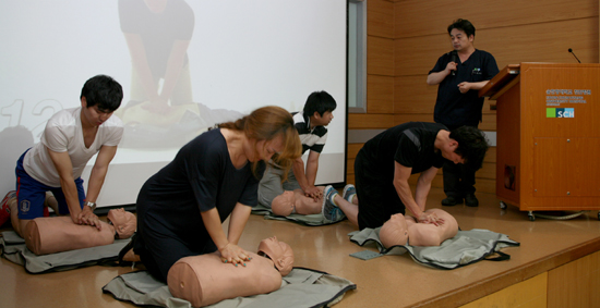 교육은 암강좌에 이은 심폐소생술 이론교육과 실습 순으로 진행됐다.