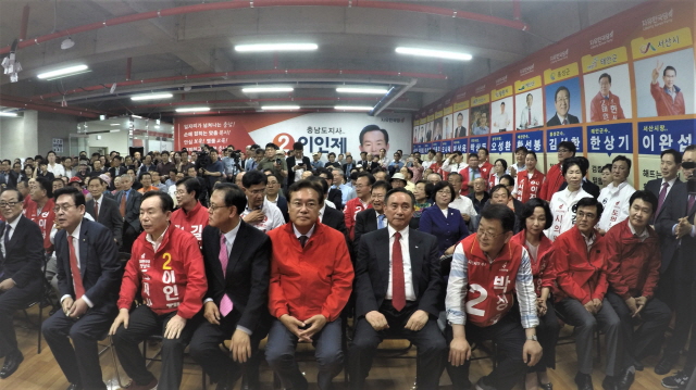 이인제 자유한국당 충남지사 후보가 17일 오후 천안시 서북구 불당동 일원에서 서청원 의원과 정진석 의원, 성일종 충남도당위원장 등을 비롯해 광역·기초의원 후보자와 지지자 등이 참석한 가운데 선거사무소 개소식을 개최했다.