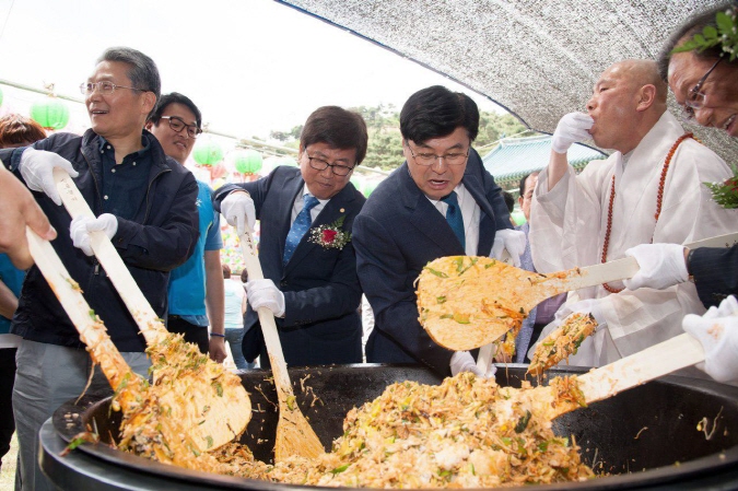 이날 봉축법요식에는 50여개 사찰스님들을 비롯해 약 700여명이 참석해 평화의 등불을 밝혔다. 행사 후에는 평화의 비빔밥을 즉석에서 비벼 참가자들에게 나눠주며 온누리에 자비가 함께하길 기원했다.