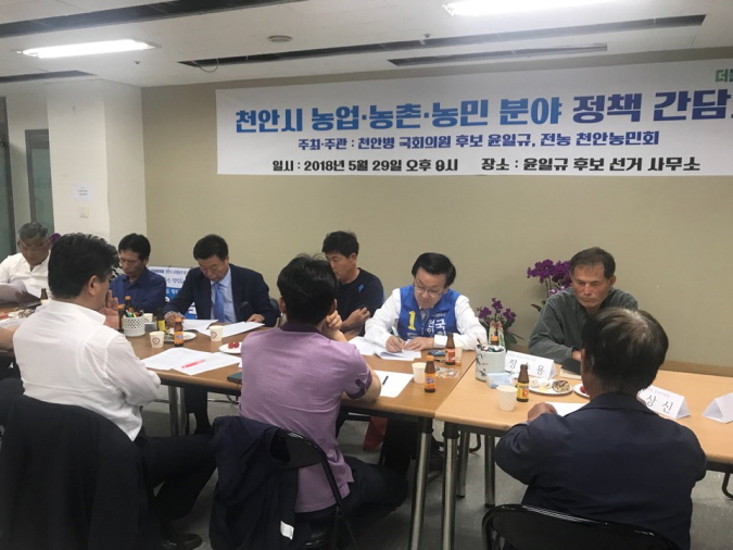 더불어민주당 천안병 국회의원 윤일규 후보와 천안갑 국화의원 이규희 후보는 29일 쌍용동 선거사무실에서 천안농민회 전현직 간부와 함께 농업·농촌·농민 분야 정책 간담회를 가졌다.