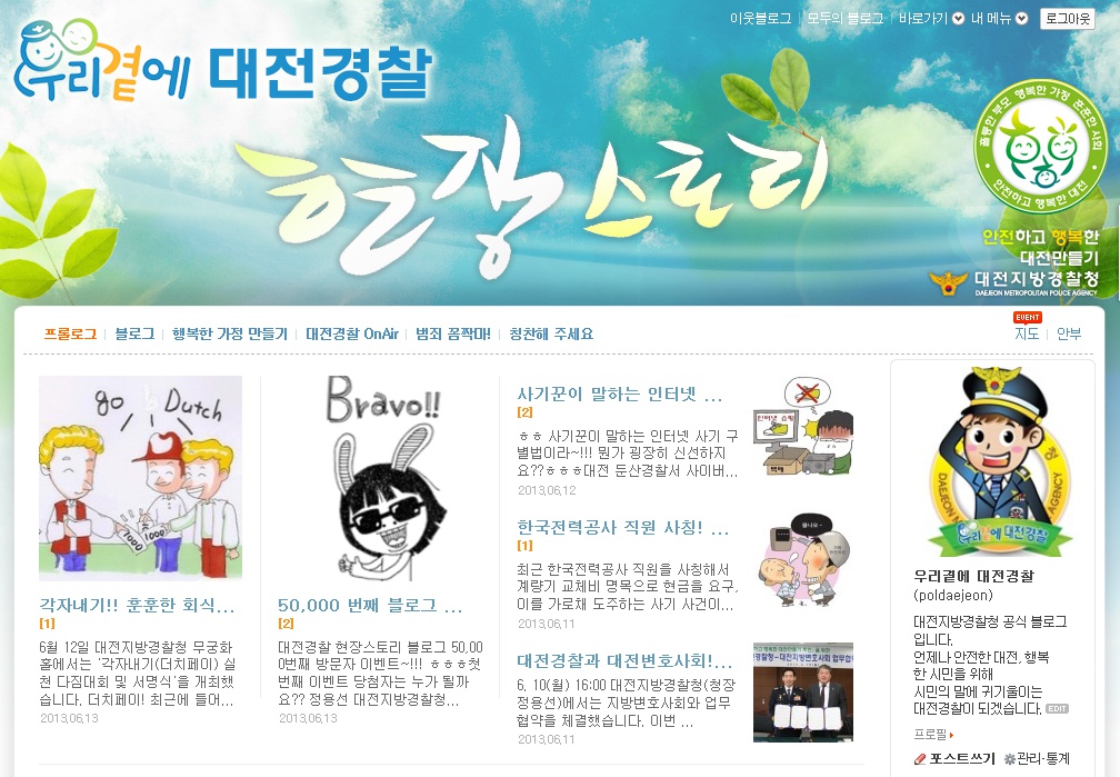 정용선 청장은 “앞으로 블로그와 SNS를 통해 소통네트워크를 만들어, 시민에게 꼭 필요한 치안 정보와 각종 범죄 예방법을 실시간으로 공유해 대전이 전국에서 가장 안전하고 행복한 도시로 거듭날 수 있도록 온 힘을 다 하겠다”고 말했다.