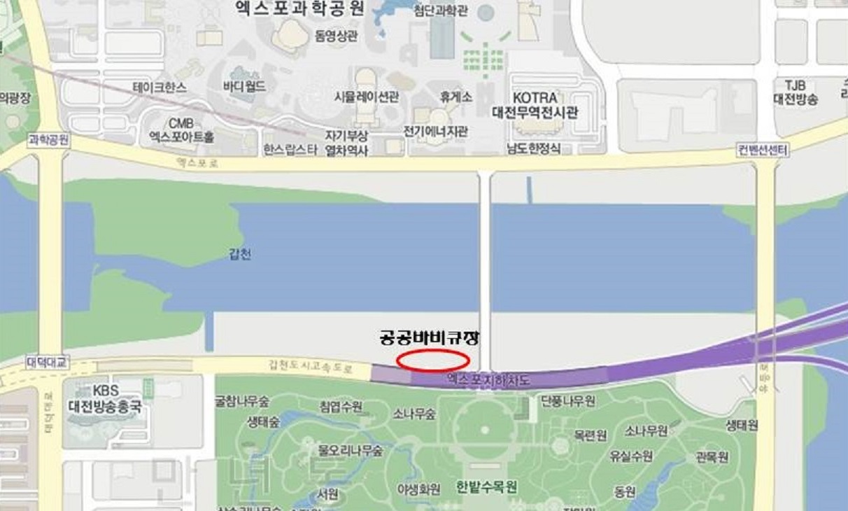 비비큐 장은 엑스포다리 남단변의 갑천과 한밭수목원 사이의 하천 제방 상부에 파고라 2동, 테이블 및 의자 4개, 전기그릴 8구, 음수대 등이 갖춰졌다.