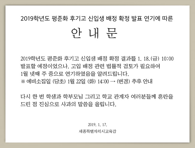 2019학년도 평준화 후기고 신입생 배정결과에서 오류로 인한 후순위 학생에 대한 최종 재배정 결과발표가 당초 예정됐던 18일에서 다음 주 중으로 연기된다.