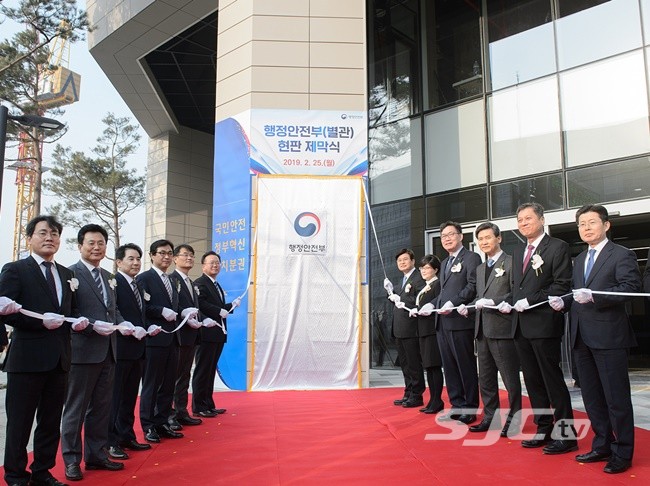 25일 세종시 어진동 행정안전부 별관에서 김부겸 행정안전부 장관과 윤종인 차관, 류희인 재난안전관리본부장, 이춘희 세종시장 등 내빈들이 함께 현판제막식을 하고 있다.