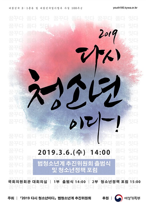 올해 3·1운동 및 대한민국 임시정부수립 100주년을 맞아 범청소년계 추진위원회가 '2019 다시 청소년이다'를 내걸고 6일 국회의원회관 대회의실에서 출범식을 갖는다.여성가족부(장관 진선미)는 청소년을 미래 100년의 주체로 인식하고 청소년 중심의 정책 재정비 및 전환 계기를 마련하고자, 청소년 관련 23개 기관 및 단체 등과 뜻을 모아 범청소년계 추진위원회를 구성할 수 있도록 후원하였다.출범식에는 '청소년 미래를 말하다'를 주제로 청소년 대표 4명과 진선미 여가부 장관이 함께하는 공연이 진행된다. 2부 행사에서는 '청소년계 100년의 회고와 미래비전'을 주제로 정책 포럼도 열린다.정책 포럼에는 전문가와 함께 청소년이 직접 토론자로 참여하여 다가올 미래 100년, 4차 산업혁명 시대에 청소년이 주도성을 갖고 자신의 미래를 설계하기 위한 다양한 논의가 이루어질 예정이다.여가부는 "범청소년계가 함께 소통하고, 청소년 주도성 회복 운동을 사회에 알리는 첫 계기가 될 것"이라며 "과거 우리 역사 속의 청소년의 위상과 역할을 성찰하고, 미래 포용사회의 주체로 청소년을 인식하는 출발점이 될 것으로 기대 한다"고 밝혔다.