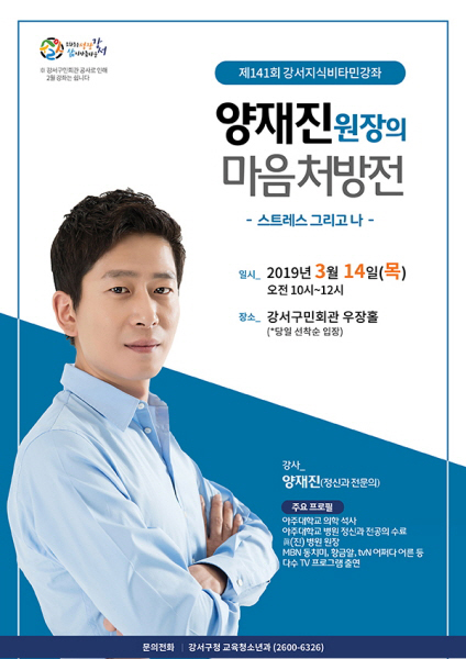 구 관계자는 “봄을 맞이해 이번 강서지식비타민강좌는 심리학 특강으로 마련했다.”라며 “양재진 원장이 제시하는 마음처방전을 듣고 일상생활을 하며 받은 마음의 상처를 치료하는 시간이 되셨으면 좋겠다.” 라고 말했다.