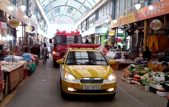 이 훈련은 대형화재에 취약한 시장에서 화재 시 신속한 출동을 위해 소방통로 확보에 대한 중요성 및 시민 공감대 형성을 위해 실시됐다.