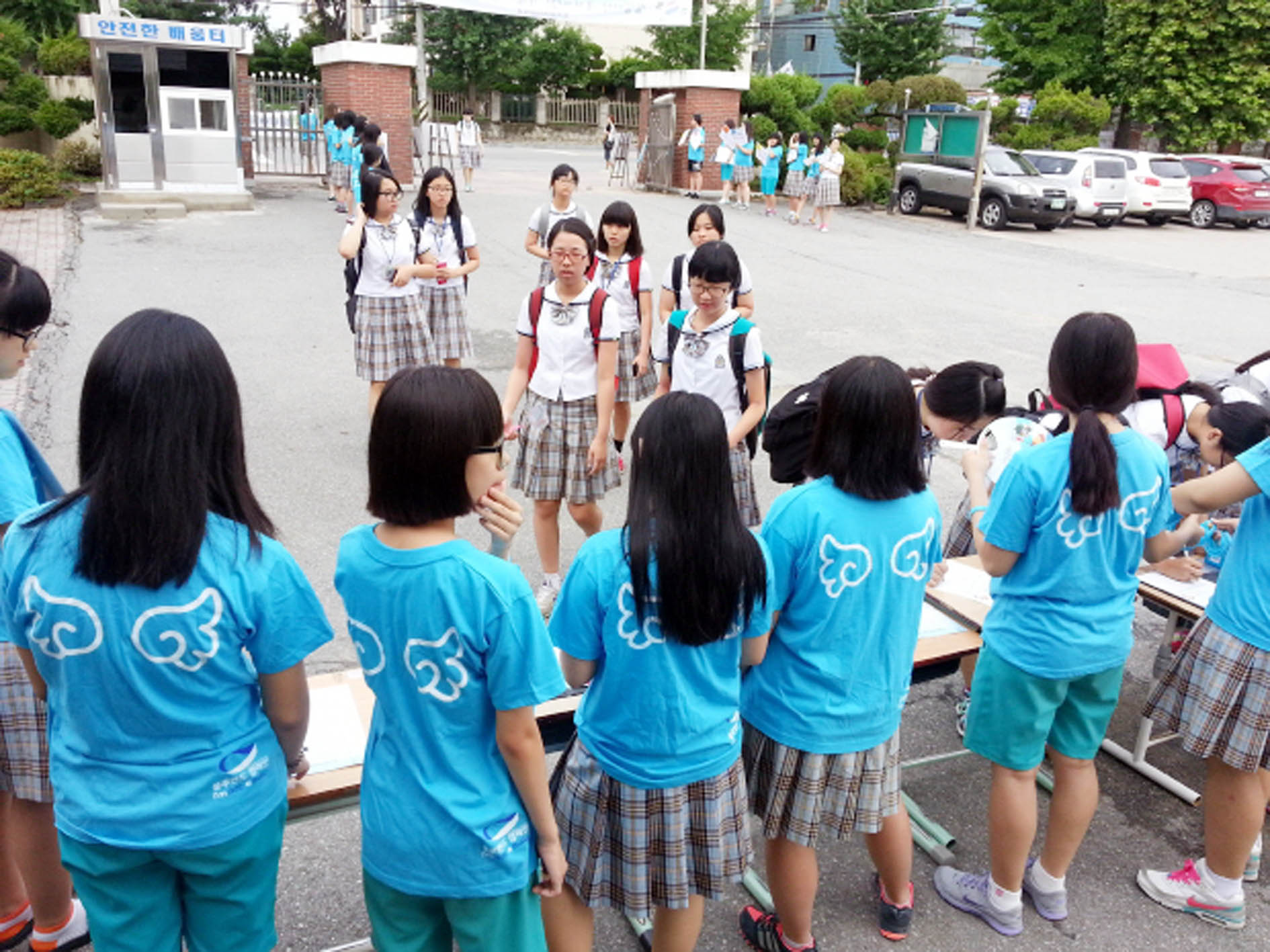 조치원여자중학교(교장 박경희)는 지난 18일(목) 아침 등교 시간에 교문 앞에서 『학교폭력 NO 블루밴드 연합동아리』 주체로 등굣길 학교폭력예방 캠페인 활동을 실시했다.