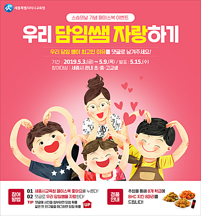 담임 선생님이 가르쳐 주신 사랑, 선생님의 자랑스러운 점 등을 세종시교육청 공식 페이스북(www.facebook.com/Sejongedu) 이벤트 게시글에 댓글로 달면 되며, 이벤트 상품으로 당첨된 학생의 학급에 치킨상품권이 지급 될 예정이다.