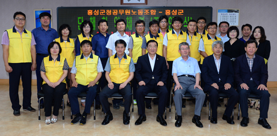 김석환 홍성군수와 이순광 홍공노 위원장은 23일 오전 9시 30분 군청회의실에서 노사 양측 교섭위원 20명이 참석한 가운데 단체협약을 체결했다.