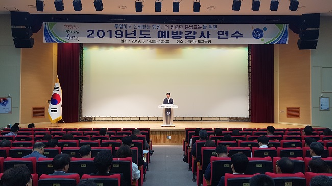 충남교육청(교육감 김지철)은 도내 각 급 학교와 기관의 교육비리, 부정행위를 사전에 예방해 교육행정의 투명성을 높이고 깨끗한 청렴 공직문화를 조성하기 위해 14일 대강당에서 교감, 행정실장 등 320여명을 대상으로 예방감사 연수를 실시했다.