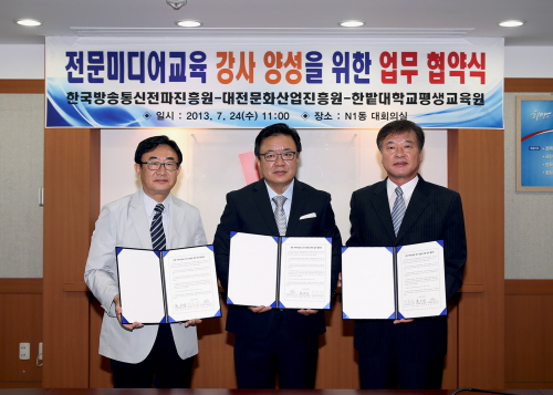 한밭대학교 평생교육원(원장 김철규)은 지난 24일 오전 11시 한밭대학교 대학본부(N1동) 2층 대회의실에서 한국방송통신전파진흥원 및 대전문화산업진흥원과 함께 ‘대전지역 미디어교육 강사양성을 위한 다자간 업무협약’을 체결했다.