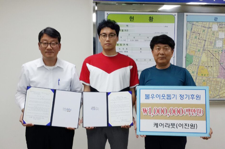 김웅 성정1동장은 “전달받은 성금은 주위에 생활이 어려운 이웃에게 잘 전달해 따스한 온정을 나눌 수 있도록 하겠다”고 전했다.