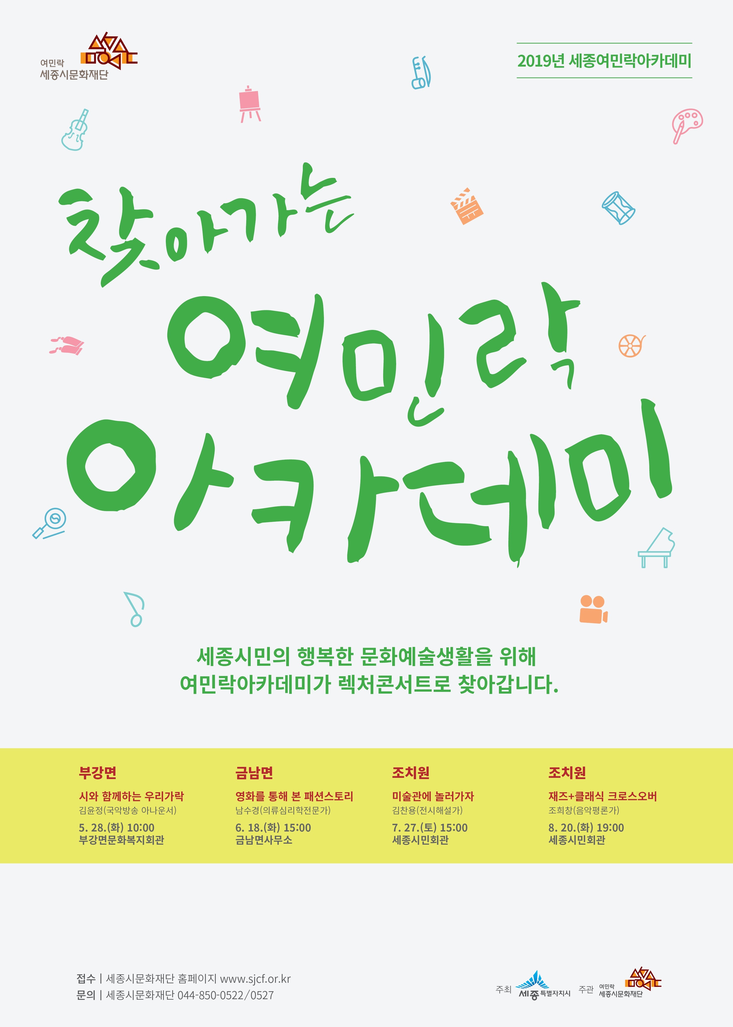찾아가는 여민락아카데미는 무료로 진행되며, 수강을 원하는 경우 문화재단 홈페이지(www.sjcf.or.kr)나 전화(044-850-0522, 0527)로 하면 된다.