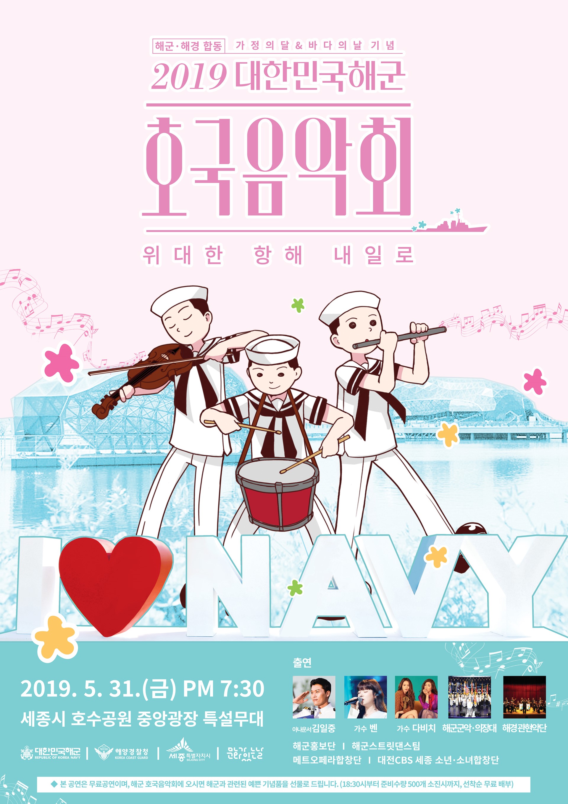 이번 음악회는 김일중 아나운서의 사회로 진행되며, 해군 군악‧의장대, 해경 관현악단을 비롯해 해군 홍보단, 대전CBS 세종 소년·소녀합창단, 메트오페라합창단, 초청가수 다비치, 벤(Ben), 성악가 한혜열 등 250여 명이 출연한다.