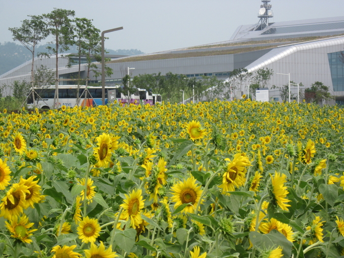 푸른 하늘에 하얀 구름, 그 아래에는 바람결에 살랑거리는 색색의 아름다운 코스모스와 노란색 자태를 뽐내는 해바라기가 도청과 경찰청, 교육청 사이에서 파노라마처럼 이색적인 풍경을 연출하고 있다.