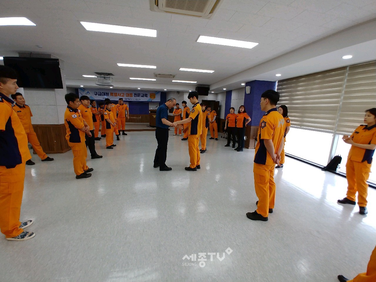 세종소방본부(본부장 배덕곤)가 27일 조치원소방서 4층 대회의실에서 구급대원 40여 명을 대상으로 구급대원 폭행사고 대응 전문교육을 실시했다.
