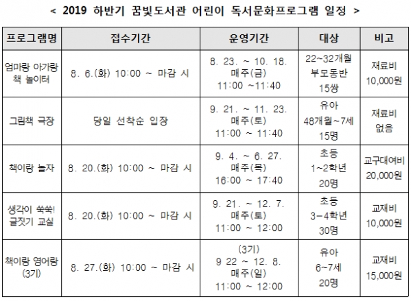 부모 동반 22~32개월 영유아를 대상으로 하는 ‘엄마랑 아가랑 책 놀이터’는 동화구연과 촉감활동, 소리탐색 등을 통해 다양한 감각을 키울 수 있도록 해주며, 6~7세 유아를 대상으로 하는 ‘책이랑 영어랑’은 영어와 그림책을 연계해 영어 및 독서에 대한 흥미를 유발한다.