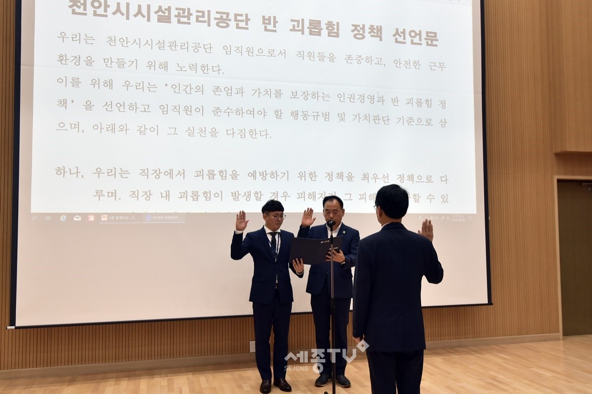 천안시시설관리공단(이사장 이원식, 이하 공단)은 6일 천안축구센터에서 전 임직원이 참석한 가운데 ‘직장 내 괴롭힘 근절을 위한 반(反)괴롭힘 정책선언식’을 개최했다.