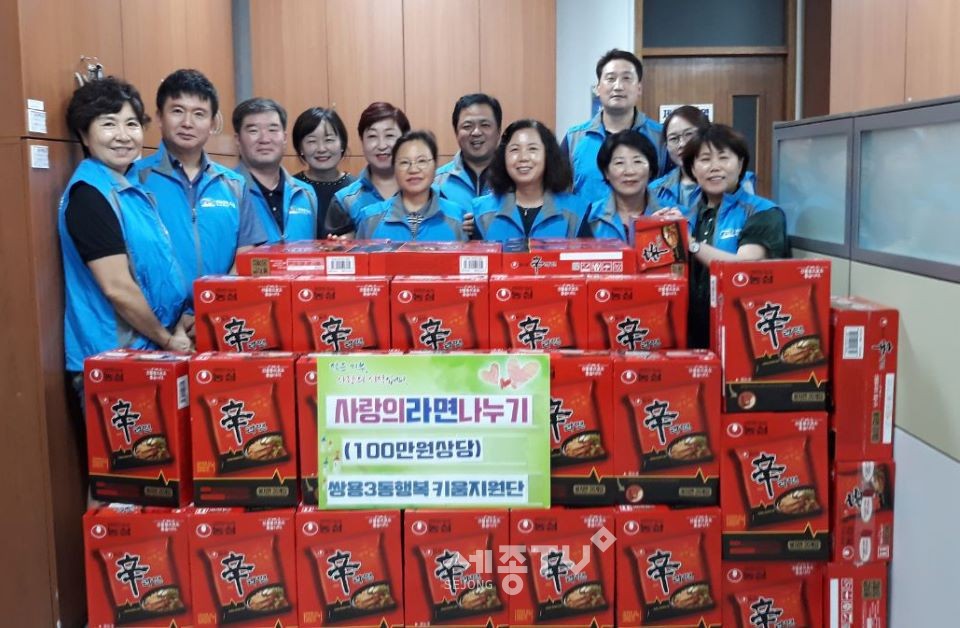 천안시 쌍용3동(동장 이제선)은 행복키움지원단(공동단장 이제선, 임경숙)이 4일 민족의 고유 명절 추석을 맞아 어려운 이웃을 위한 위문물품으로 라면 77박스(100만원 상당)를 전달했다고 밝혔다.