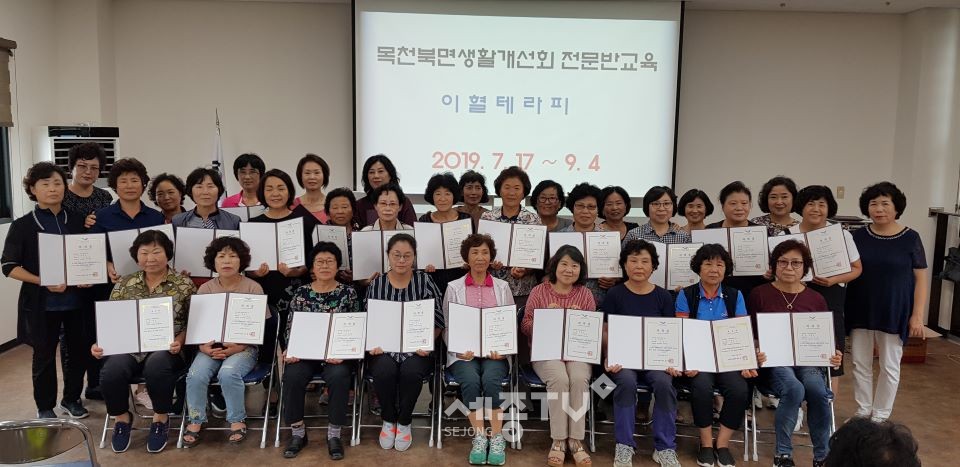 천안시농업기술센터(소장 강성수) 목천북면생활개선회원 28명이 이혈테라피 3급 민간자격증을 취득했다.