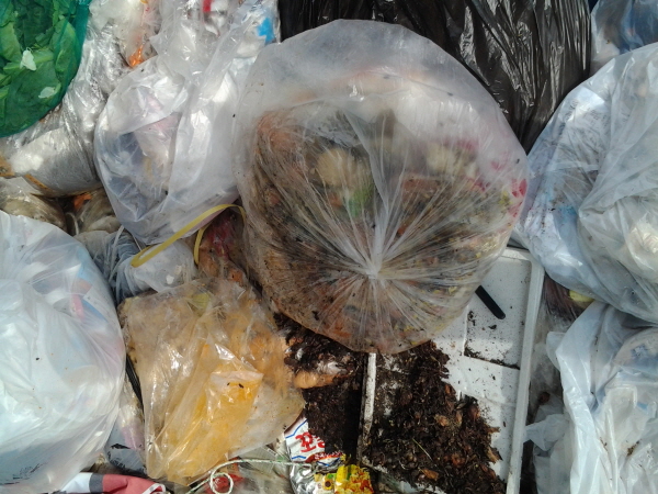 휴게소내 식당 등에서 쏟아져 나오는 음식물 쓰레기를 일반폐기물과 섞어 투명비닐봉투에 내놓아 쓰레기 분리수거 정책을 위반하고 있다.