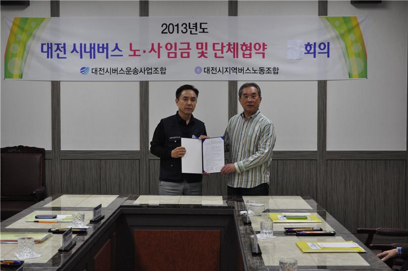 대전시 시내버스운송사업조합(이사장 김광철)과 대전지역버스 노조(위원장 양재화)는 충남노동위원회 조정 기간 중인 12일 추가협상을 벌여 노사의 원만한 합의로「2013년도 시내버스 임금 및 단체 협상」안에 서명했다