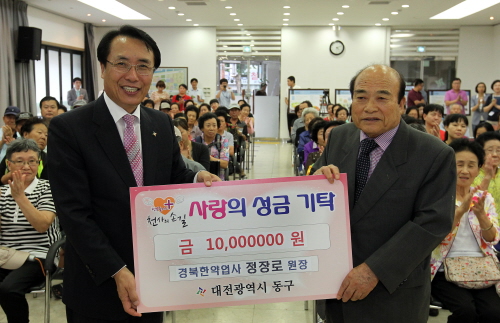 충남 서천에서 경북한약방을 운영하고 있는 정장로 원장(79)은 지난 12일 중앙시장 이벤트 홀에서 대전 동구(구청장 한현택) 지역의 쪽방거주자와 저소득층 100세대에 세대당 10만원씩 1천만원의 성금을 전달했다.