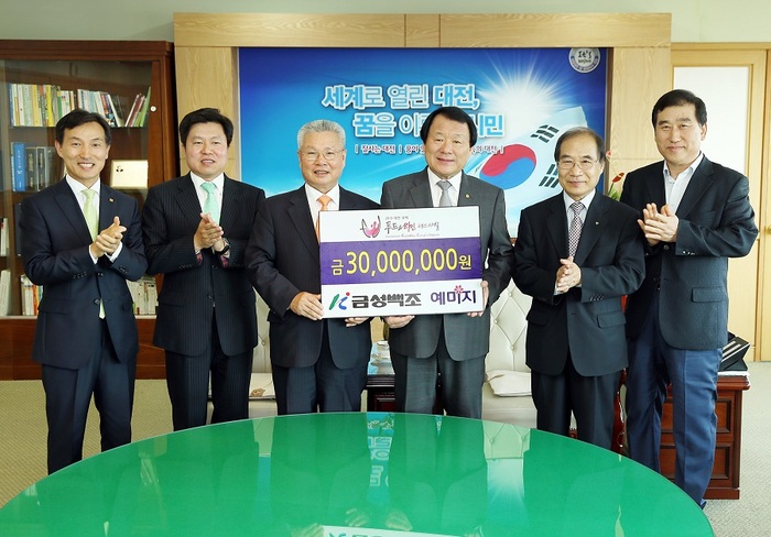정성욱 ㈜금성백조 회장은 23일 오후 4시 대전시청을 방문하고 2013 대전국제푸드&와인 페스티벌의 성공 개최를 위해 써달라며 후원금 3천만 원을 염홍철 대전시장에게 전달했다.