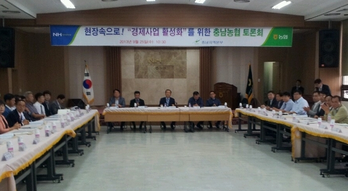 농협중앙회 충남지역본부(본부장 김병문)은 25일 대전시 중구 대사동 소재 지역본부 회의실에서 충남관내 15개 시·군에서 경제사업을 담당하고 있는 지역농협 전·상무를 비롯하여 시·군 농정지원단장 등 52명이 참석한 가운데 충남농협의 경제사업 활성화를 위한 과제발굴 토론회를 개최했다.