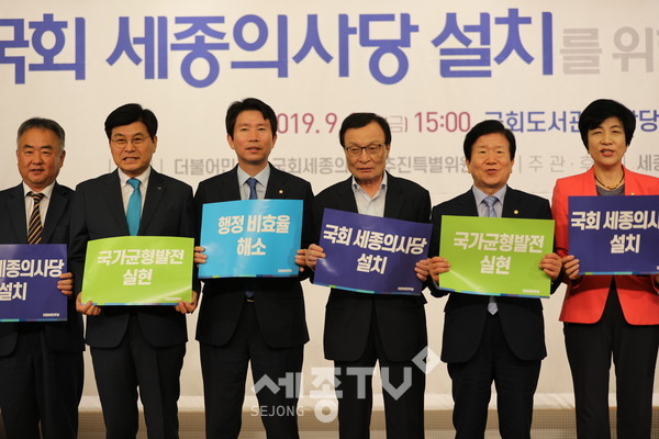 이해찬 더불어민주당 대표는 "국회 세종의사당 설치는 행정적 효율성 확보와 국가 균형발전 실현의 중요한 계기가 될 것"이라며 "오는 2025년까지는 설치해야 한다"고 강조했다.