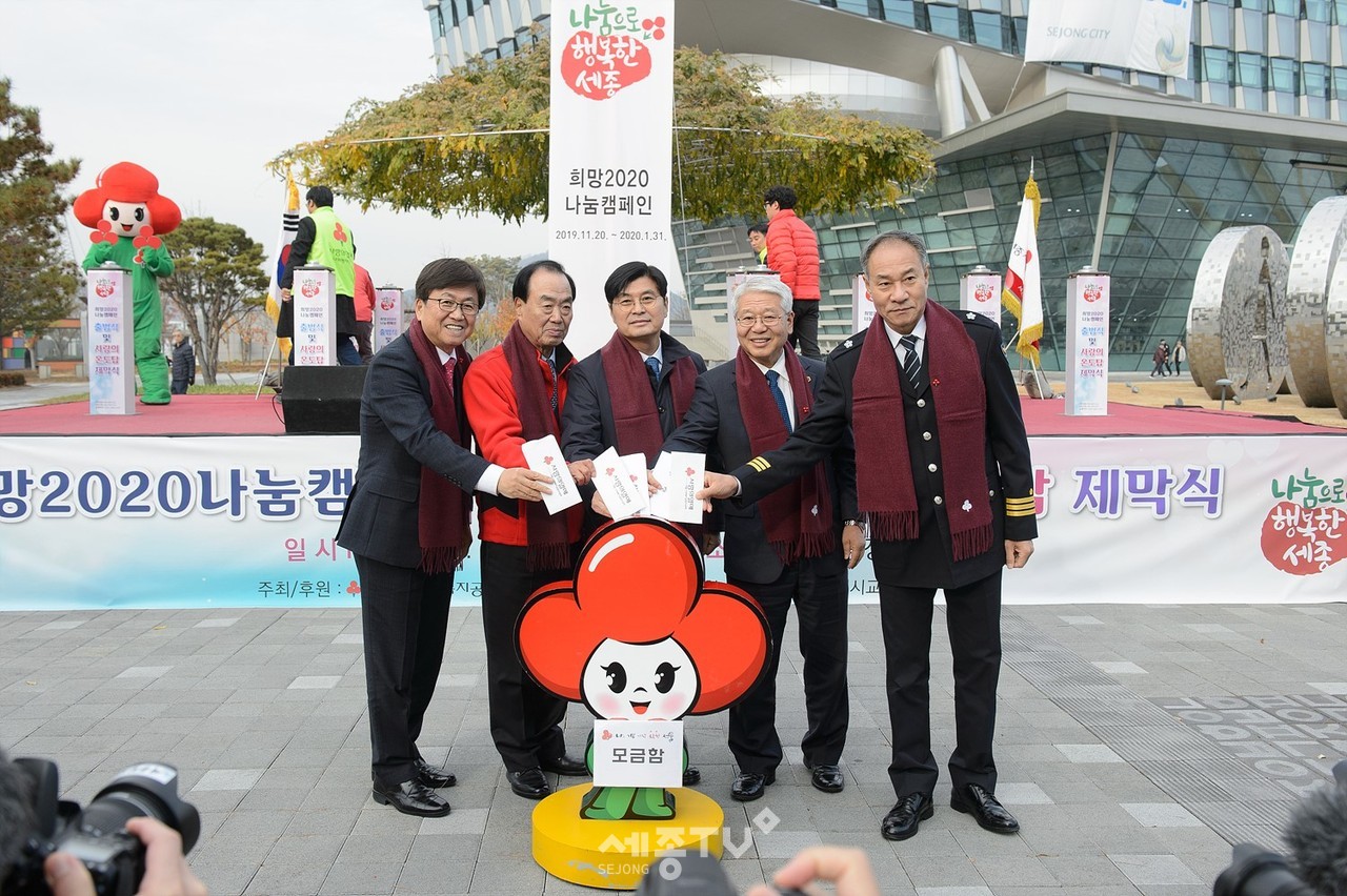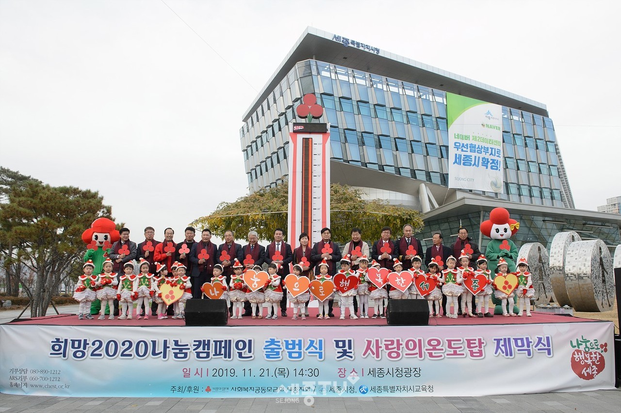 세종특별자치시(시장 이춘희)는 21일 시청 광장에서 세종사회복지공동모금회(회장 홍영섭) 주관으로 ‘희망2020나눔 캠페인 출범식 및 사랑의 온도탑 제막식’을 개최했다고 밝혔다.