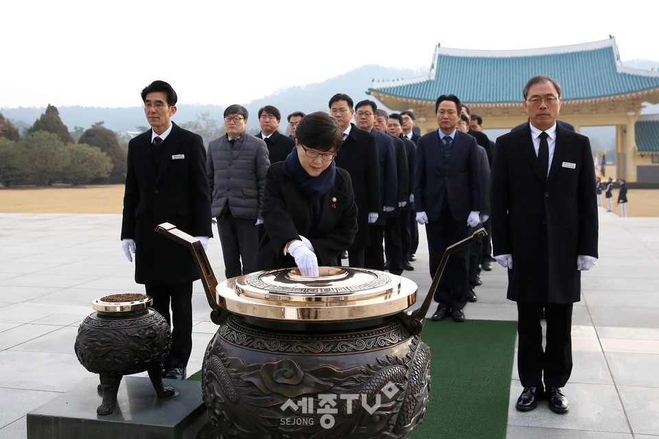 김진숙 행정중심복합도시건설청장(사진 가운데)은 3일(금) 간부들과 함께 국립대전현충원을 찾아 순국선열과 호국영령의 숭고한 희생정신을 기리는 참배를 하고 있다. 저작권자 © SJB세종TV 무단전재 및 재배포 금지 세종TV 다른기사 보기 페이스북 트위터 카카오톡 네이버블로그 구글+ URL복사 기사공유하기