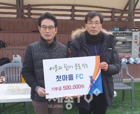 세종특별자치시 첫마을에프씨(회장 박동건)가 지난 6일 한솔동 지역사회보장협의체(공동위원장 박순영·김온회)에 관내 어려운 이웃을 돕기 위한 성금 50만 원을 기부하며 따뜻한 마음을 전했다.