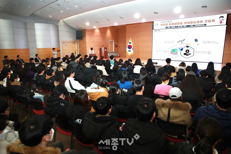 천안시는 30일 오후 시청 대회의실에서 겨울방학 동안 시청을 비롯한 각 현업부서에 배치돼 근무한 아르바이트 대학생 110명과 간담회를 진행했다고 밝혔다.