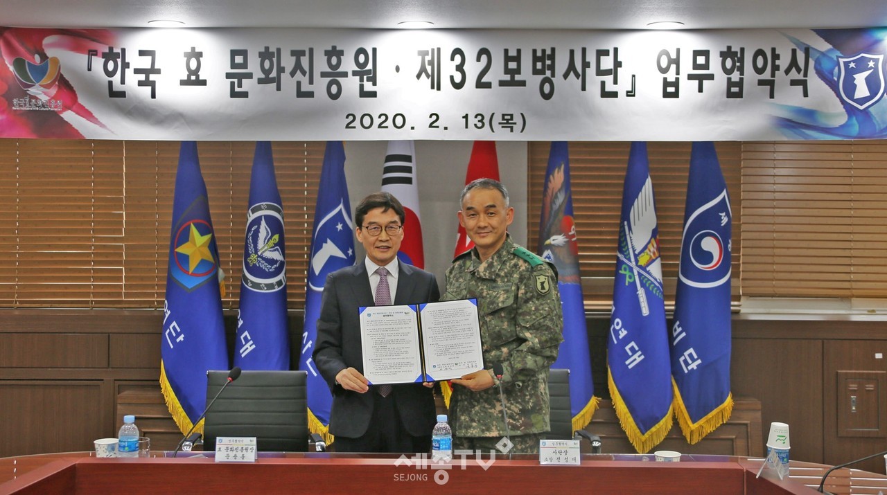 한국효문화진흥원(원장 문용훈)은 2월 13일 15시 육군 제32보병사단(사단장 전성대 소장)과 군 장병들의 효·인성교육 함양을 위한 업무협약을 체결했다.