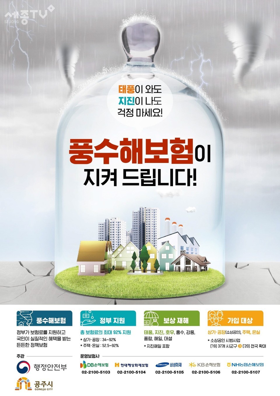 공주시(시장 김정섭)가 예기치 않은 풍수해 재난에 대비해 능동적인 대처와 실질적인 보상을 실현하기 위해 풍수해보험 가입을 적극 독려하고 나섰다.