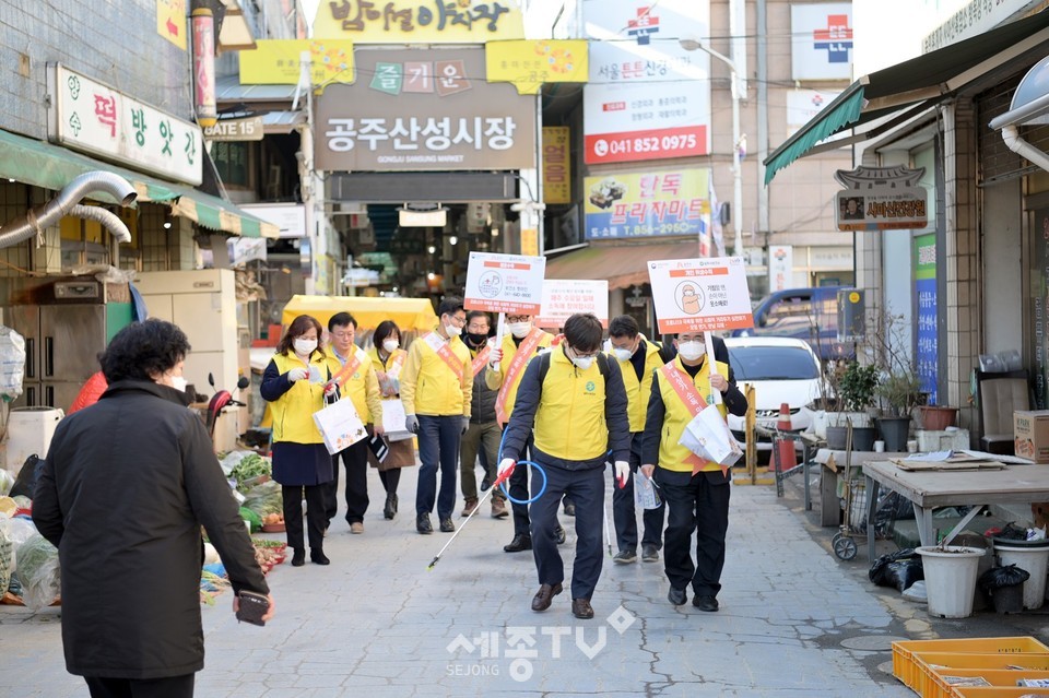 김정섭 시장을 비롯한 각 실과 부서장과 직원 등 200여명은 산성시장과 종합버스터미널 일원 상가 및 통행로, 공중화장실 등을 대상으로 방역 소독을 실시했다.