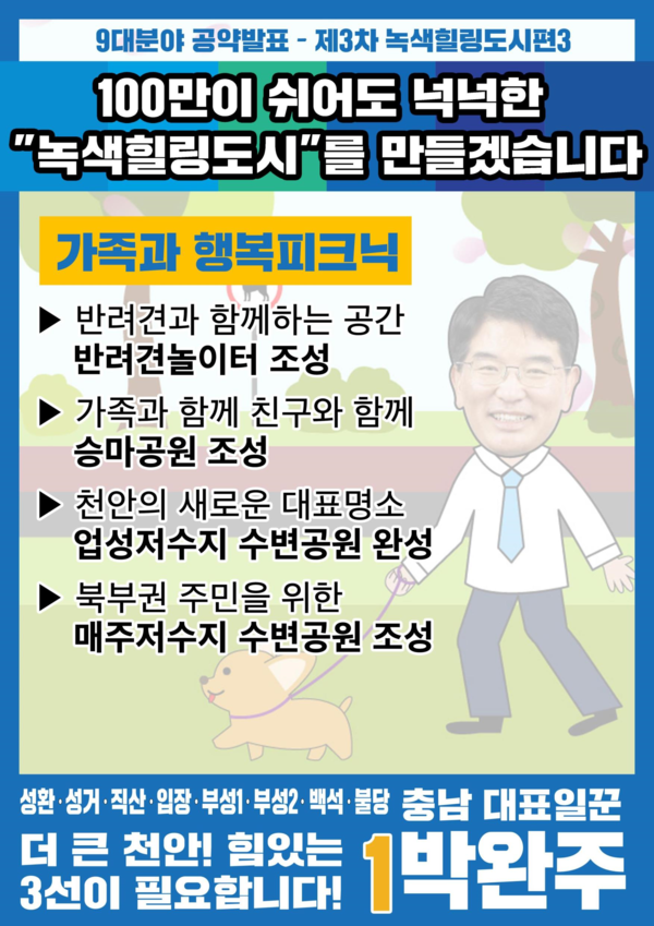 마지막 주제인 <가족과 행복피크닉>에서 박 의원은 “온 가족이 함께할 녹색공간을 마련하겠다”며 ▲반려견이 마음껏 뛸 수 있는 놀이터 조성 ▲힐링 재활 스포츠 승마공원 조성 ▲천안 대표명소 업성저수지 수변공원 완성 ▲북부권 매주저수지 수변공원 추가 조성 등 4가지를 공약으로 내걸었다.