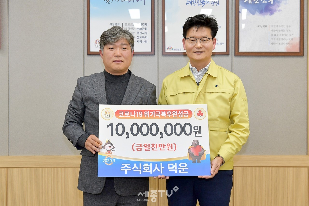 공주시(시장 김정섭)는 지난 16일 (주)덕운(대표이사 유재훈)이 시청을 방문해 코로나19 위기극복을 위한 성금 1천만 원을 기탁했다고 밝혔다.