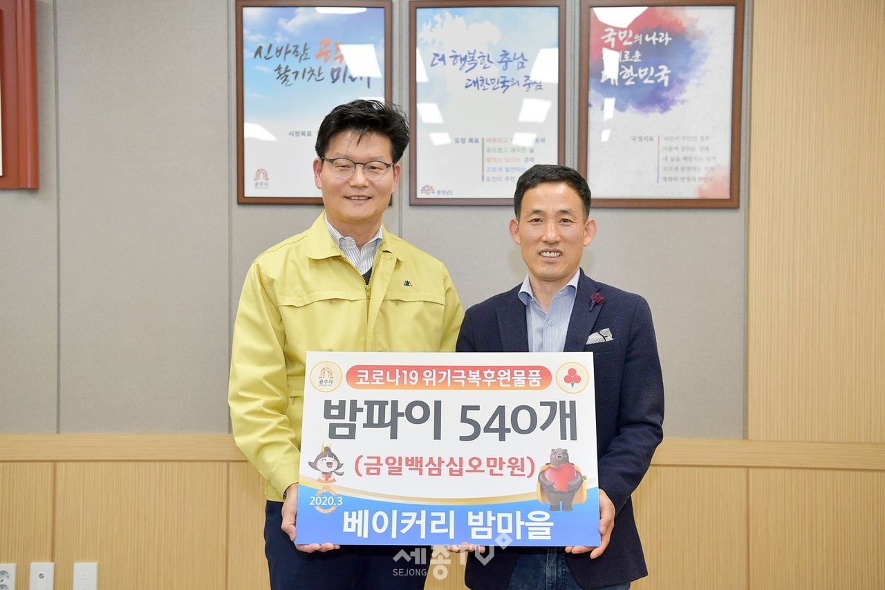 한편, 이날 베이커리 밤마을(대표 김인범)에서도 코로나19 대응을 위해 힘쓰고 있는 의료진과 자원봉사자들에게 지원해 달라며 밤파이 540개(135만원 상당)를 전달해 훈훈함을 더했다.