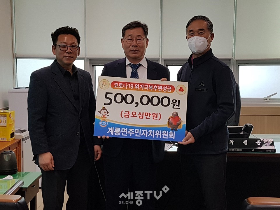 공주시 계룡면주민자치위원회(위원장 김지성)는 지난 19일 코로나19 위기극복에 보탬이 되고 싶다며 성금 50만원을 계룡면에 기탁했다.